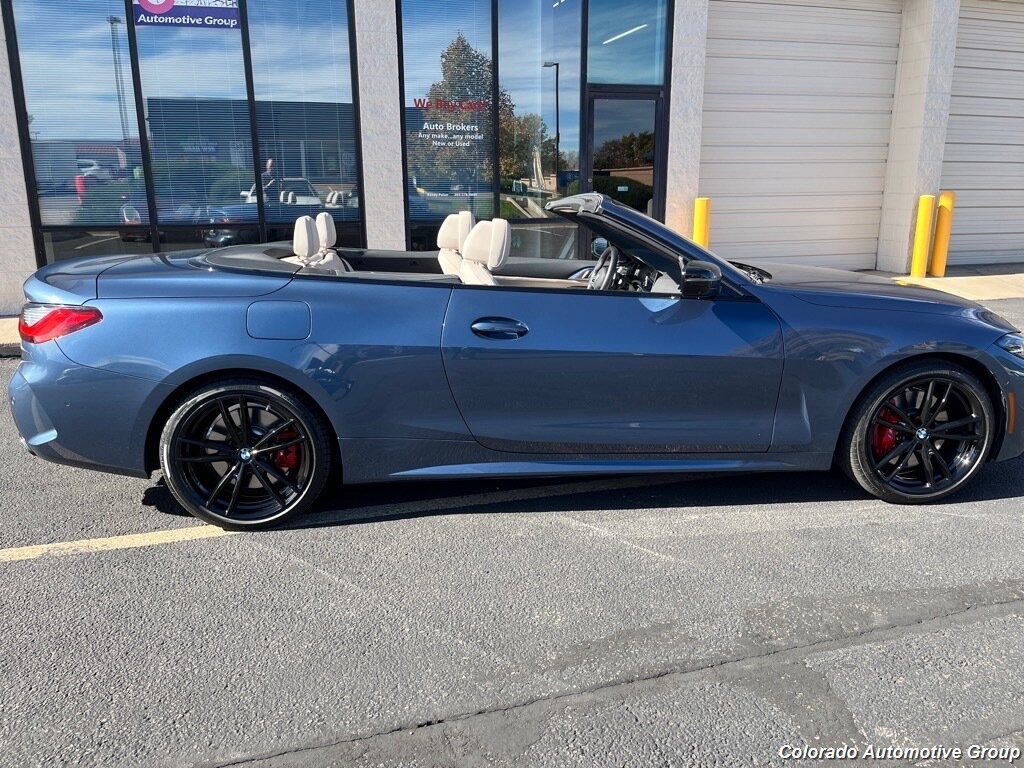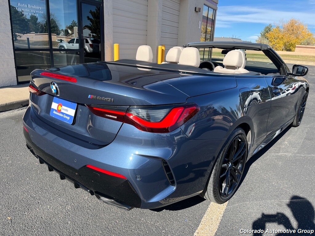 This vehicle is a BMW 4 Series M440i xDrive, made in 2023 and with only 11,709 miles on it. It has an all wheel drive system, a 3.0 liter Turbo I6 382hp 369 lb-ft engine, and direct injection for maximum power and efficiency. The tanzanite blue ii metallic (c3z) exterior gives it a sleek look, while the canberra beige (khfy) interior provides comfort and style. Vehicle features include touch screen display, Bluetooth audio connection, blind spot sensor, hill start assist, and full time four wheel drive navigation system with voice recognition, Bluetooth phone connectivity, and leather seats. This car is sure to turn heads wherever it goes! Contact Details: Colorado Automotive Group, 5801 E County Line Place, Highlands Ranch, CO, 80126, rp@randypalser.com, (303) 761-7667.
